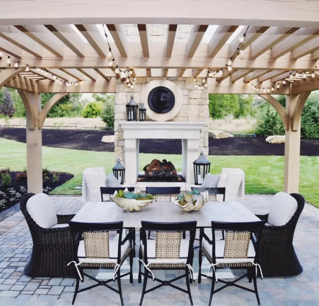- Shelter — Adding a pergola or a roofed structure over your kitchen will define the space and let you cook outside, rain or shine. If you add a fireplace or other heating source, you could also extend the barbeque season beyond summer into the fall (or even later).