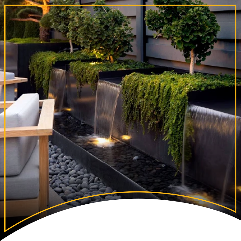Water features introduce acoustic masking. The gentle sound of flowing water buffers traffic noise and neighboring activity, creating privacy through sound. Illuminated water becomes a kinetic sculpture, with lighting revealing texture, movement, and depth that remain hidden during daylight hours.